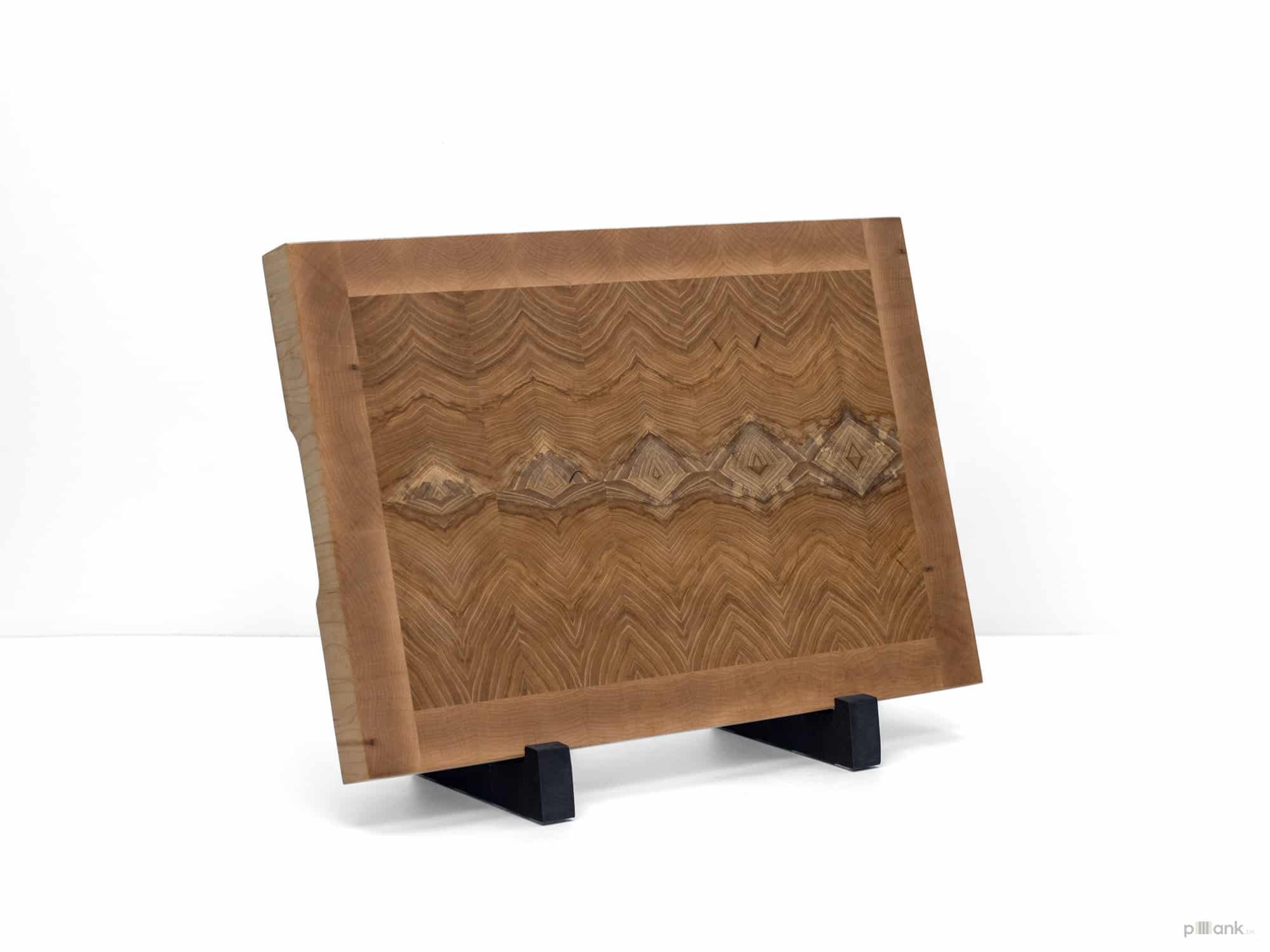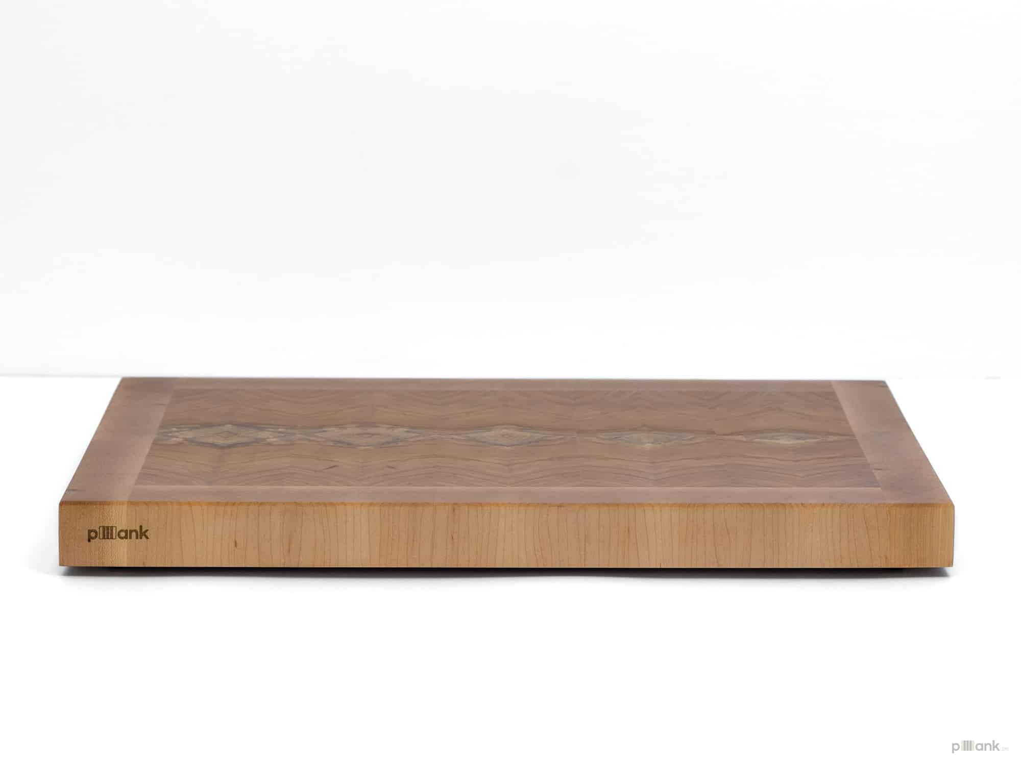 Deze kopshouten snijplank is opgebouwd rond een uitzonderlijk stuk iep/olmenhout. Door het spel tussen spint en kernhout ontstaat een natuurlijk ruitpatroon dat de plllank een rustige maar bijzondere uitstraling geeft. Handgemaakt en langs beide zijkanten voorzien van subtiel ingefreesde handvaten voor een comfortabele grip. De omlijsting in esdoorn brengt het geheel in balans en benadrukt de warme tekening van het middendeel.