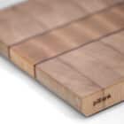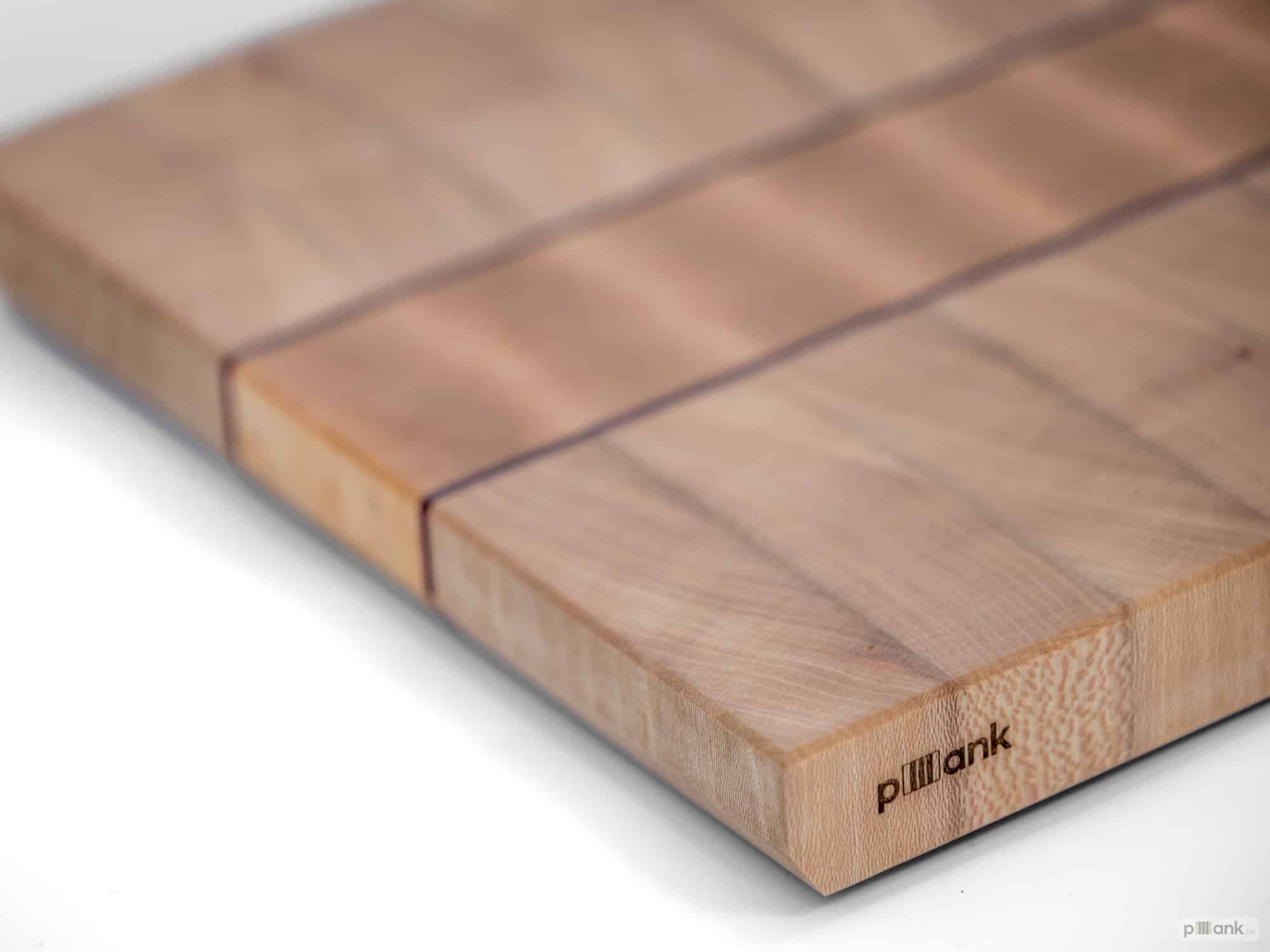 Plataan staat bekend om zijn lichte tint, zachte tekening en goede stabiliteit in kopshout. Esdoorn is hard, slijtvast en mooi egaal, waardoor het een perfecte contrasterende middenstrook vormt. Purperhart voegt met zijn natuurlijke paarse kleur een subtiel, stijlvol detail toe. Samen creëren deze houtsoorten een rustige, verfijnde snijplank voor wie houdt van lichte tinten en discrete accenten.