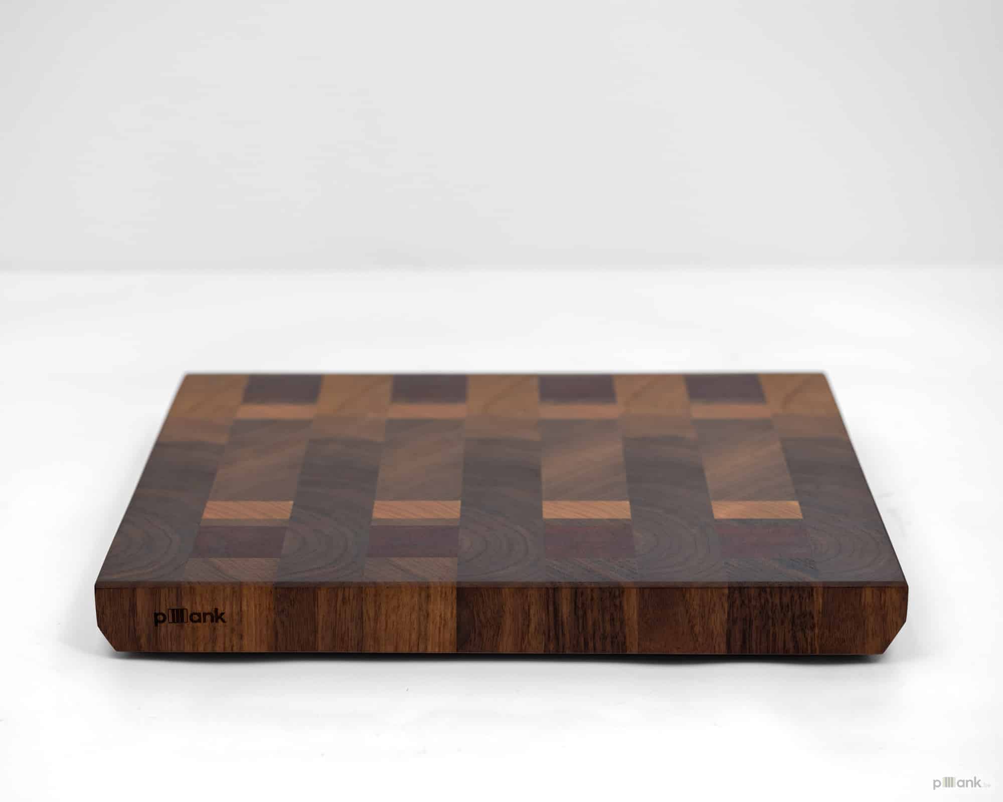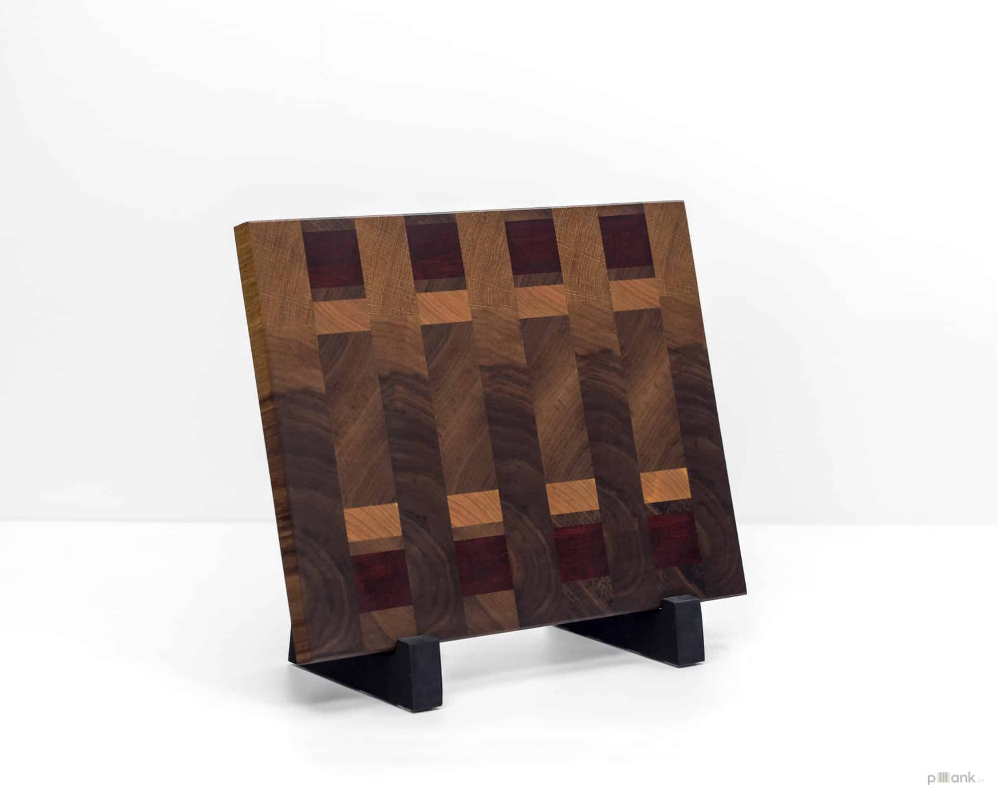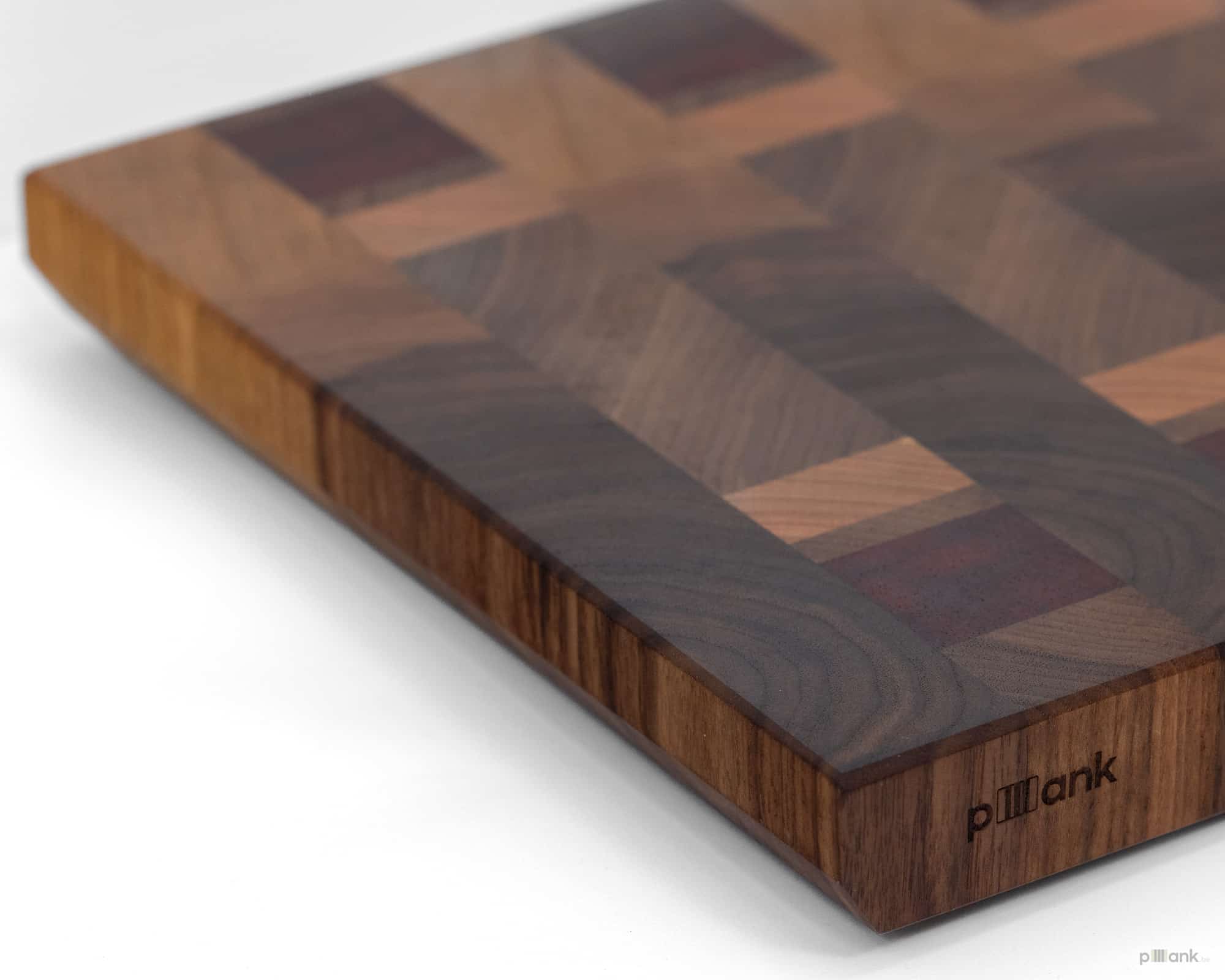 Deze kopshouten snijplank straalt klasse uit dankzij een harmonieuze combinatie van rijke houttinten en een verfijnd patroon. De basis in Amerikaanse notelaar geeft de plank een warme, donkere uitstraling, terwijl eik zorgt voor een subtiel contrast. Accenten van kerselaar en padoek brengen extra levendigheid in het geheel. De kopshouten structuur laat messen tussen de houtvezels glijden, waardoor ze langer scherp blijven en het snijoppervlak zich beter herstelt. Afgeschuinde kanten zorgen voor een comfortabele grip en maken de plank makkelijk hanteerbaar, een duurzame keuze voor wie intensief kookt en waarde hecht aan uitstraling.